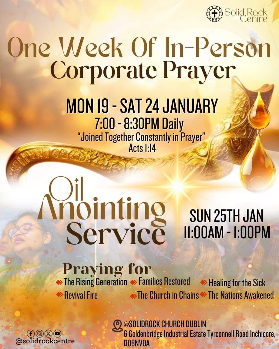 From Monday 19th to Saturday 24th January, we will gather for a focused week of in-person corporate prayer: Time: 7:00pm – 8:30pm DailyVenue: Solid Rock Dublin. This is a sacred…